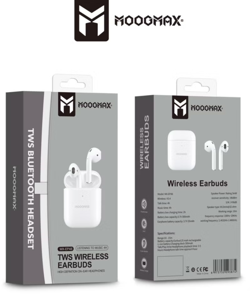 سماعات ايربودز من ماركة موج ماكس، باللون الأبيض، وبمميزات عالية الجودة شاملة للضمان لمدة سنتين، والمميزات كالتالي: